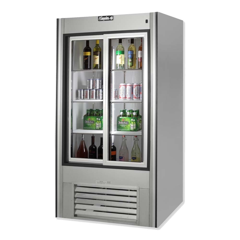 Increase impulse sales of snacks and drinks with the Leader ESLS38 commercial glass door merchandiser. This 38" wide model comes with 2 full size sliding glass doors to ease user fatigue, adjustable shelving to suit your storage needs, and a stainless steel frame that protects from rust, corrosion, and tarnishing. The ESLS38 glass door refrigerator offers 26 cubic feet of storage space so you can hold a variety of your kitchen essentials.